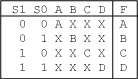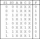 blijkt dat F = A voor de situatie dat beide selectingangen S1 en S0 0 zijn. F = B als S1 = 0 en S0 = 1 etc. De volgende tabel geeft dat weer.