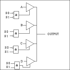 vier tristate buffer die dan zijn ingangssignaal (A, B, C of D) doorgeeft